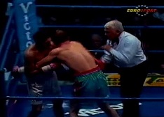 (感想:ロッシがタイトル防衛。四度目の防衛戦。挑戦者ジャコはフランス人。あのドナルド・カリーを番狂わせで破ってWBC世界J・ミドル級王座を獲得したことがある。しかし、初防衛戦でジョン・ムガビに1Rであっけなく敗北(足首をひねって続行不能になるという、つまらない負け方だった)。王座奪回を目指してテリー・ノリスに挑戦し、判定負け。負けたが、意外な善戦で粘り強さを見せた。その再起戦でロッシに挑戦。イタリア・マルサラでの一戦。ジャブで前に出るジャコ。接近してフック連打。ロッシはパターンを確立。ディフェンス、攻撃(ワンツー、右カウンター、左フック)、クリンチ(ホールド)。相手に付き合わない「自己中」なスタイル。ロッシのクリンチ殺法にイライラするジャコ。接近戦でラフな攻撃。4R終了後、両者ニラみ合い。5R、ラフ行為でジャコが減点。6R、ロッシもラフ行為で減点(実に平等な扱い)。その後も同じパターン。攻めるがかわされるジャコ、時折右ストレート、左フックを当てるロッシ。12R終了。判定は3-0。ジャッジの一人は2ポイント差。クリンチ連発のロッシ。本来、クリンチは反則なのだが、クリンチして当て逃げするパターンで今回も勝利(かっこよくない勝ち方)。本人と会場のファンは勝って大喜び。地元で戦い続ける限り安泰だろう。ジャコは他のチャレンジャーと同じようにロッシのクリンチにイライラした末、判定負け。クリンチさせないぐらいのパワーがないとロッシには勝てない。これが最後の試合となった。)